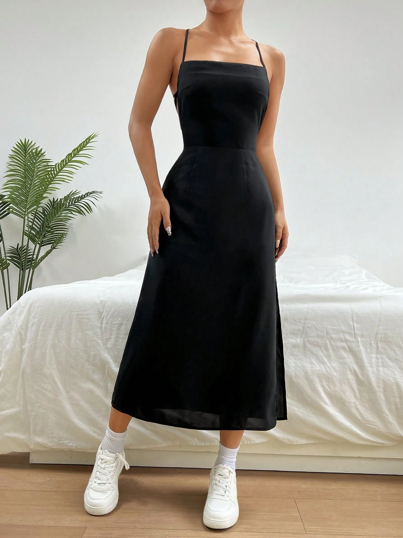 Vestido cami con dobladillo dividido y color sólido negro. Talla CH